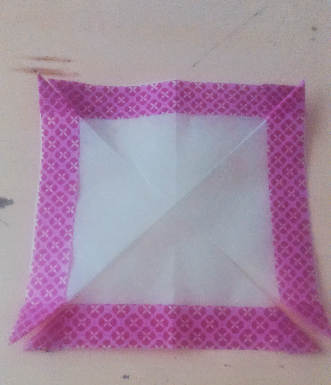 He pegado cinta washi tape en cada borde sobrepasando las esquinas.He doblado las el papel en diagonal y he cortado dos tercios de cada diagonal